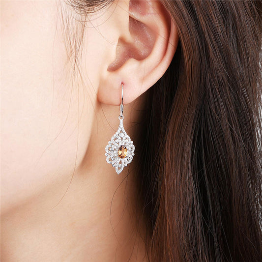 White Gold Hollow Retro Orange Gem Dangle Earrings