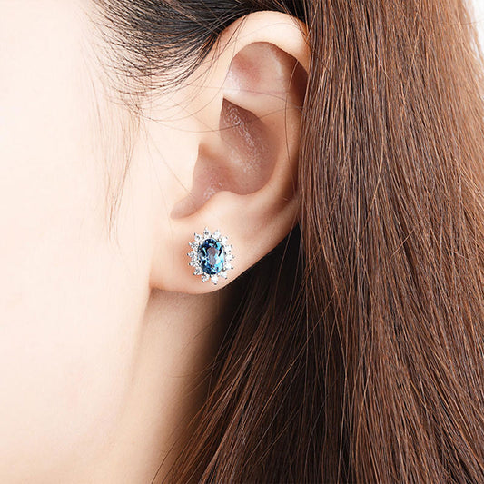 White Gold Egg Shape Full Stones Aquamarine Stud Earrings