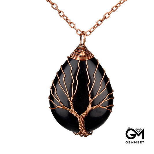Wrap Silk Life Tree Obsidian Stone Drop Necklace