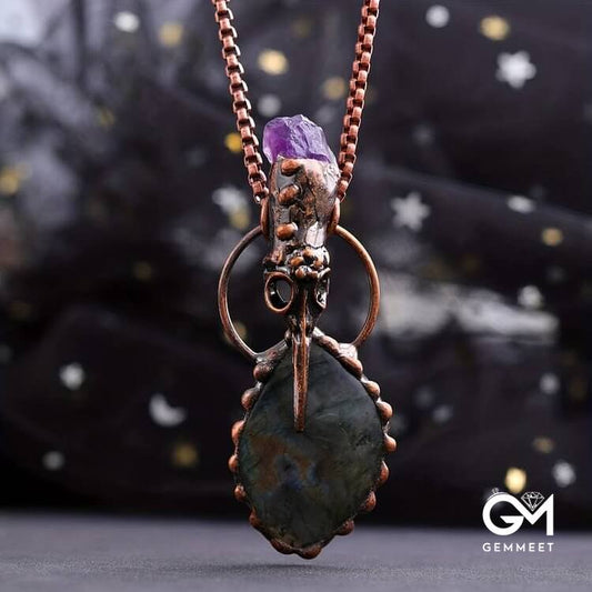 Copper Hummingbird Head Amethyst Labradorite Gemstone Necklace