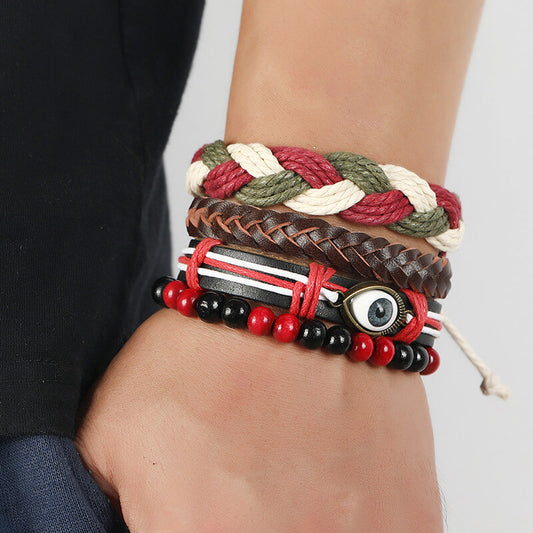 Boho Colorful Set of Four Leather Bracelets Vintage Braided Eye Bracelets