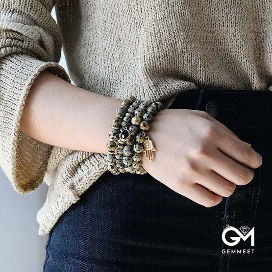 Natural Dalmatian Jasper Obsidian Hamsa Pendant Bracelet