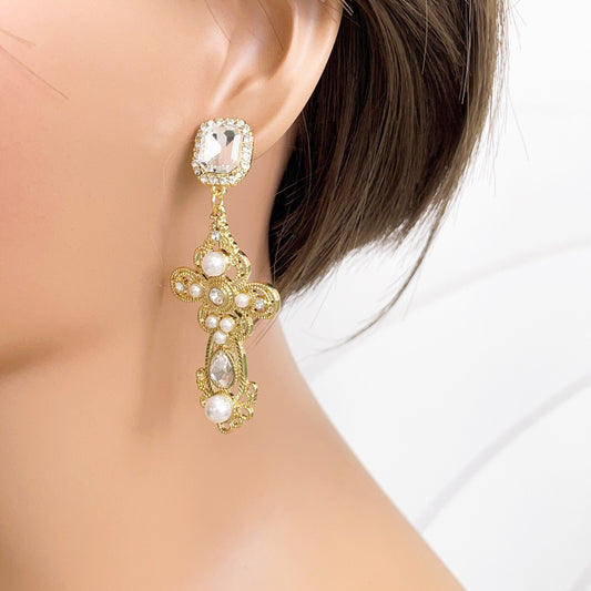 Lace Cutout Pearl Cross Drop Earrings