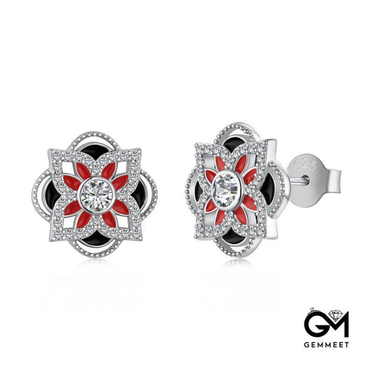 S925 Sterling Silver Four-leaf Clover Flowers Red Black Earrings