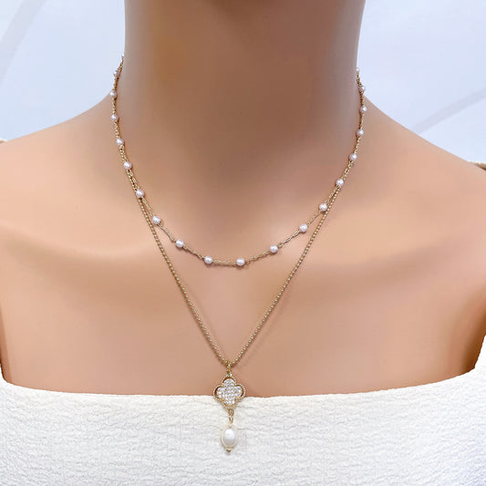 Pearl Copper Set Zirconium Four-leaf Clover Necklace