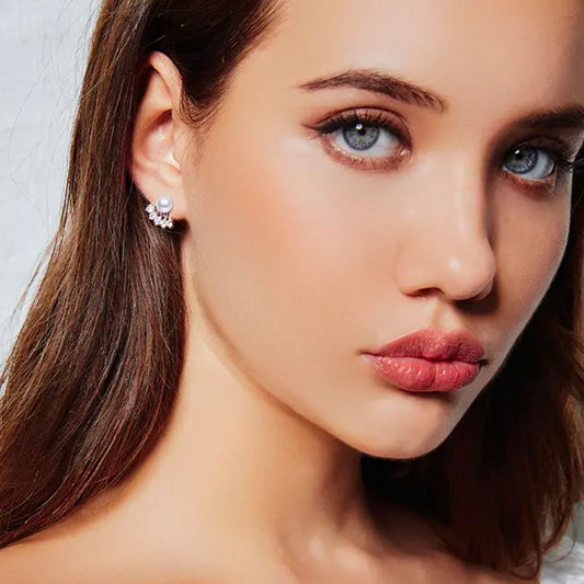 White Gold Full Stones Organic Pearl Flower Shape Stud Earrings