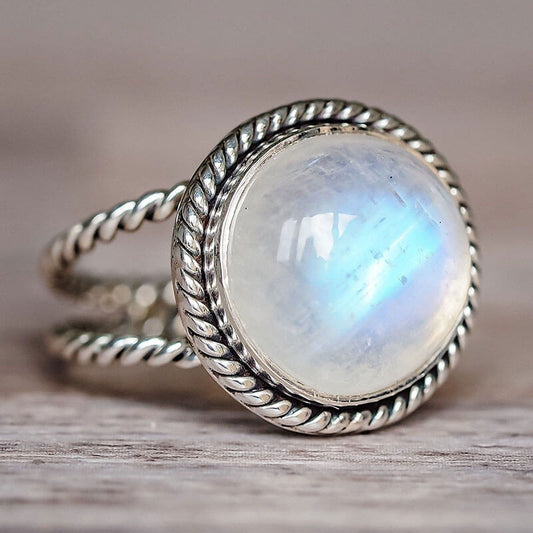 Vintage Big Round Cut Moonstone Rope Texture Ring