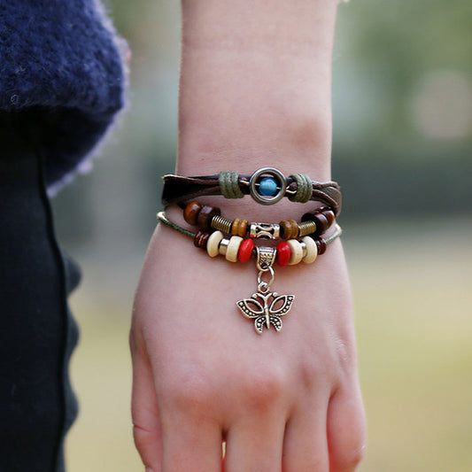 Beaded Cowhide Bracelet Multilayer Woven Vintage Butterfly Pendant Leather Bracelet