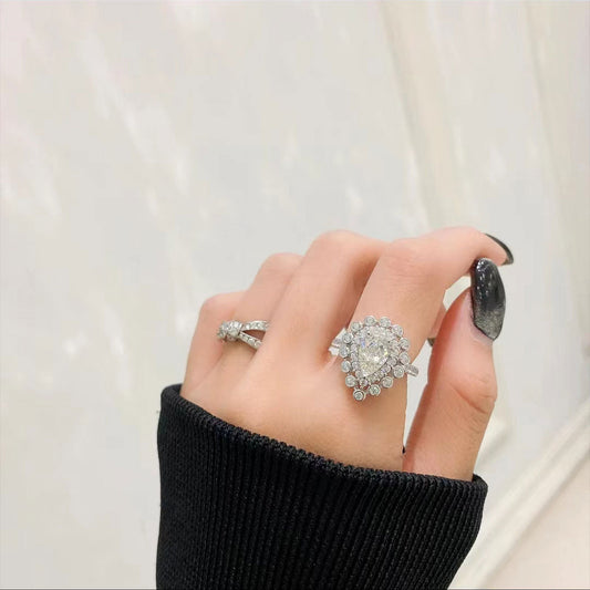 White Gold Drip Shape Bezel Setting Stones Halo Ring