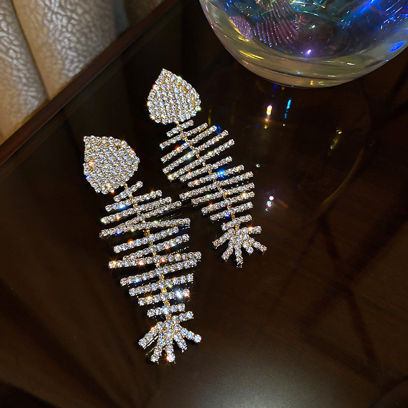 Cute Full Stones Heart Fishbone & Bow Tassel Earrings