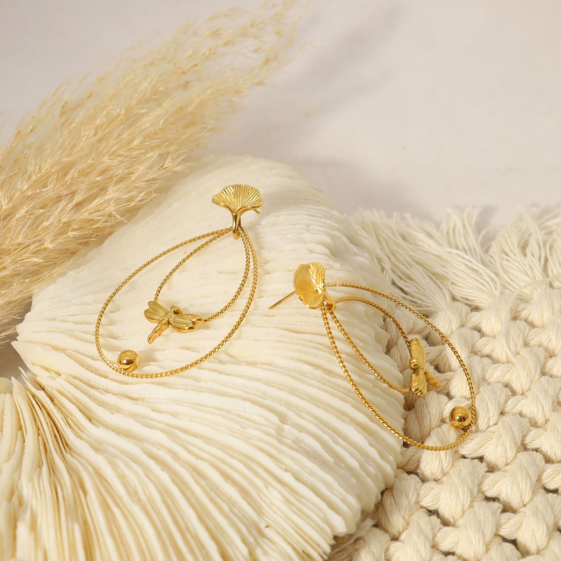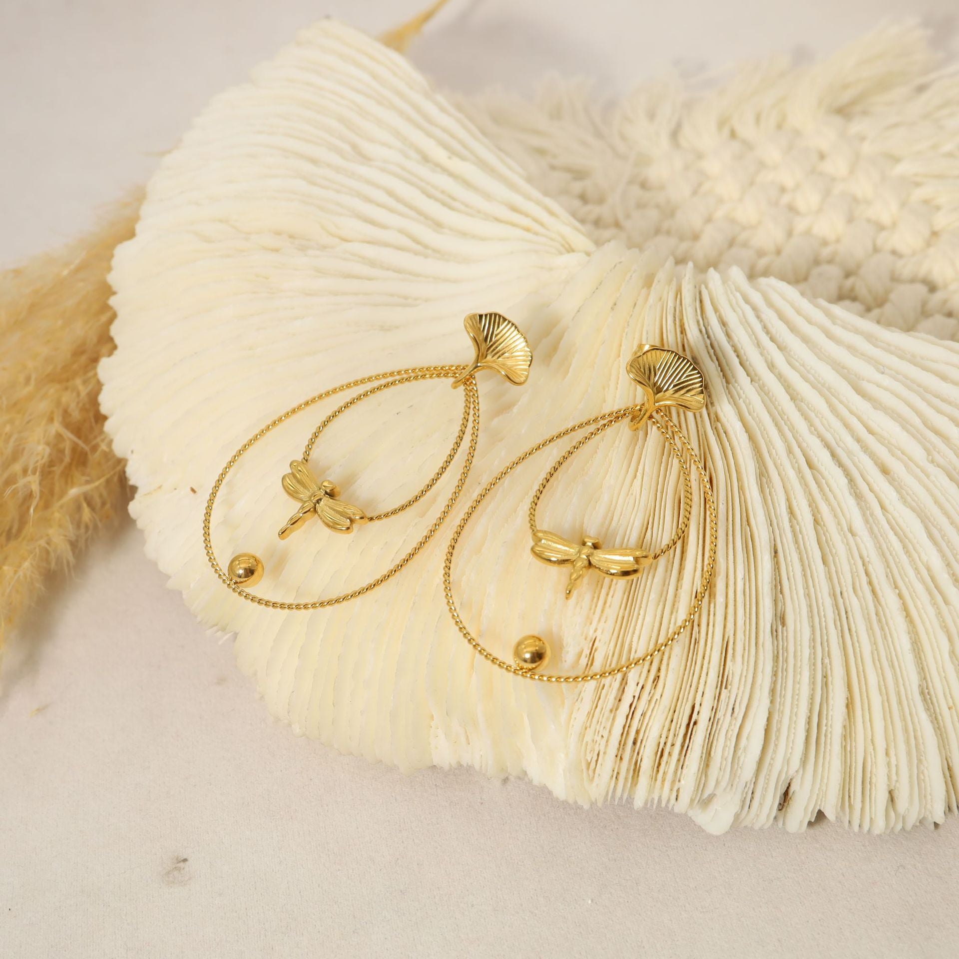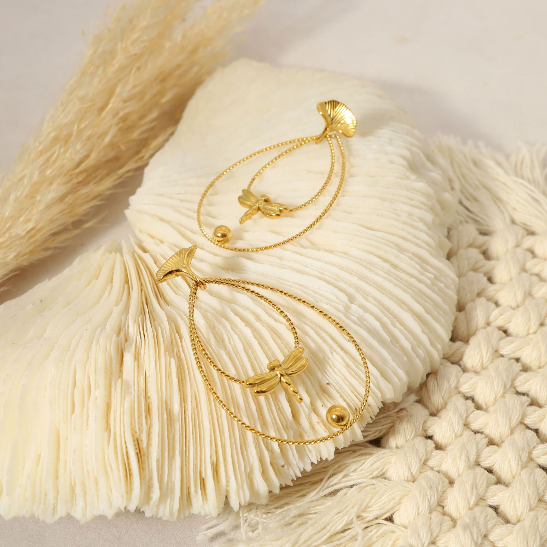 Dragonfly Gingko Drop Stainless Steel Earrings
