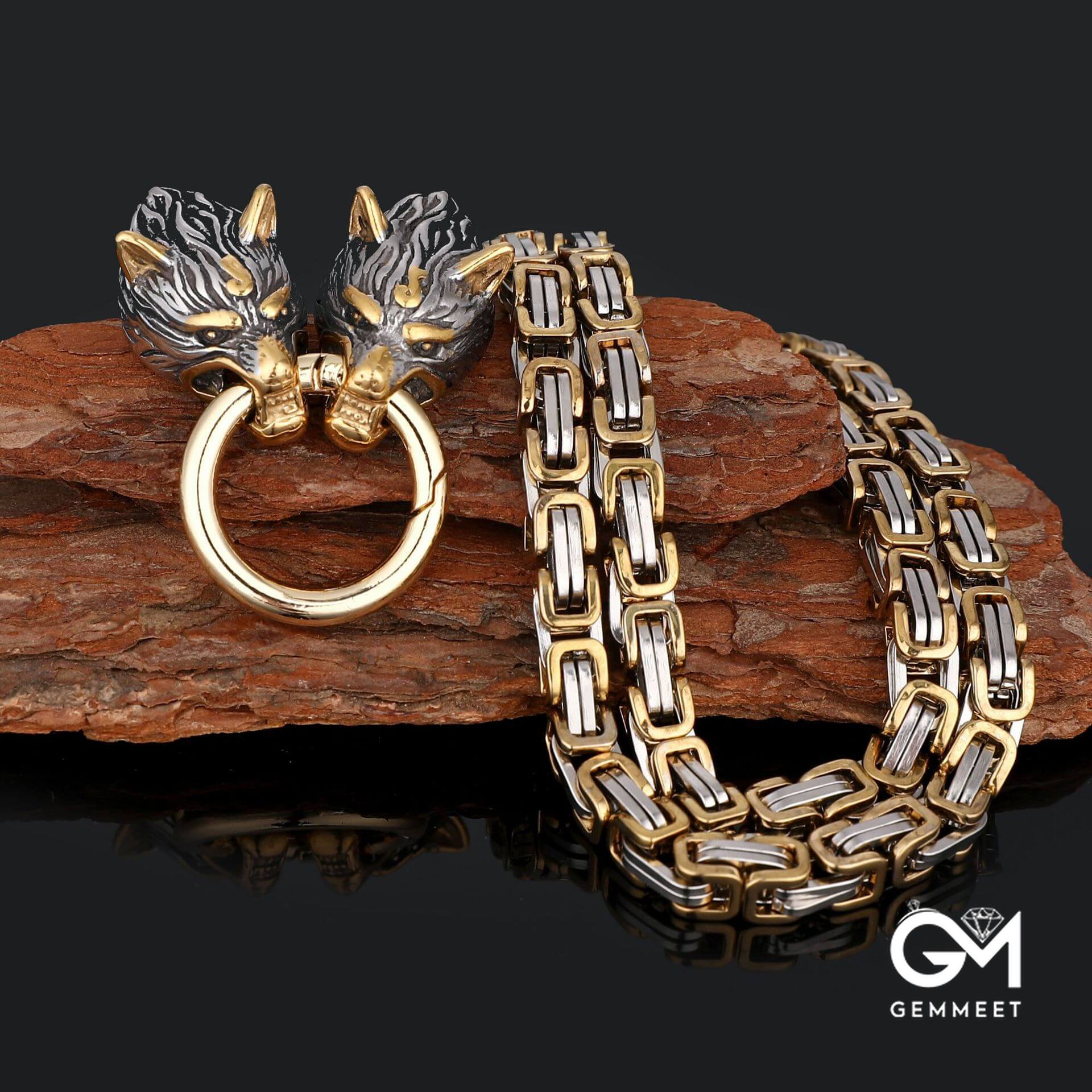 Gold Stainless Steel Wolf Head Thor Hammer Necklace