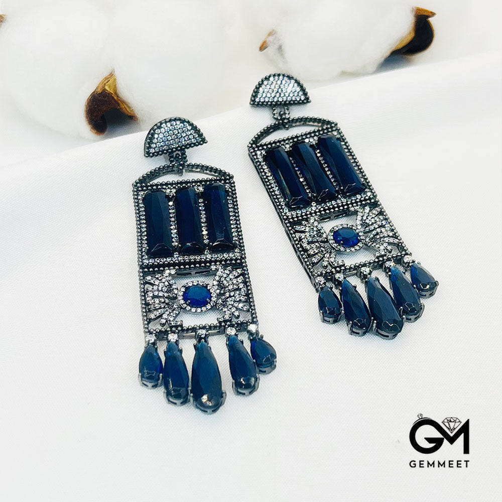 Hollow Rectangular Blue Stone Tassel Drop Earrings