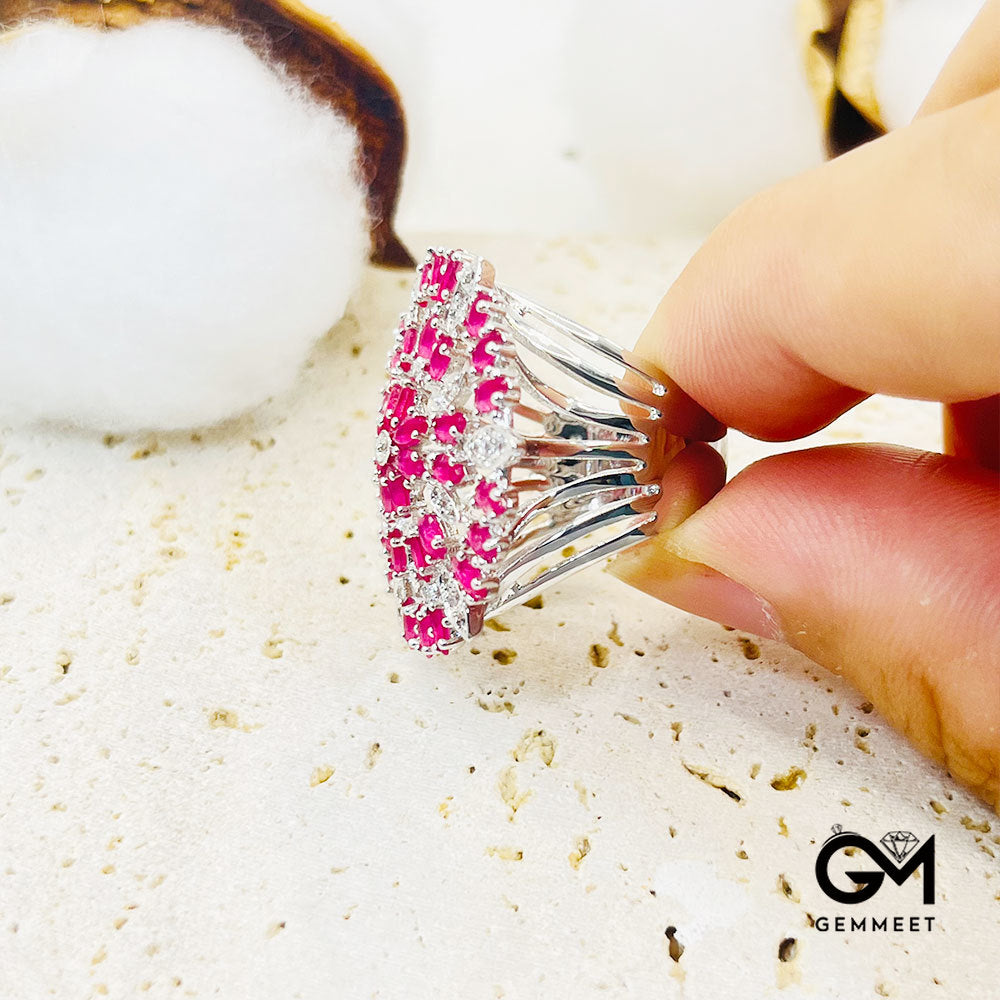 Hollow Umbrella Shape Full White & Pink Stones Signet Ring
