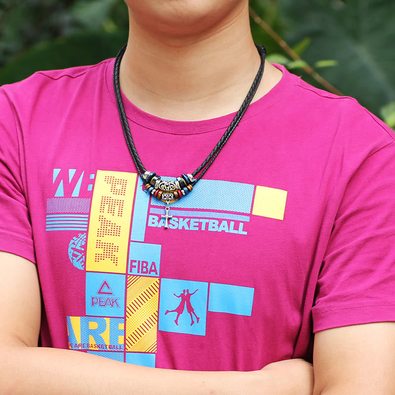 Men Leather Double Layered Braided Beaded Cross Necklace