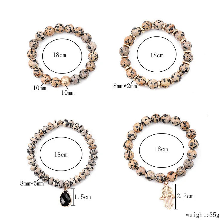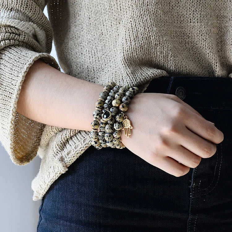 Natural Dalmatian Jasper Obsidian Hamsa Pendant Bracelet