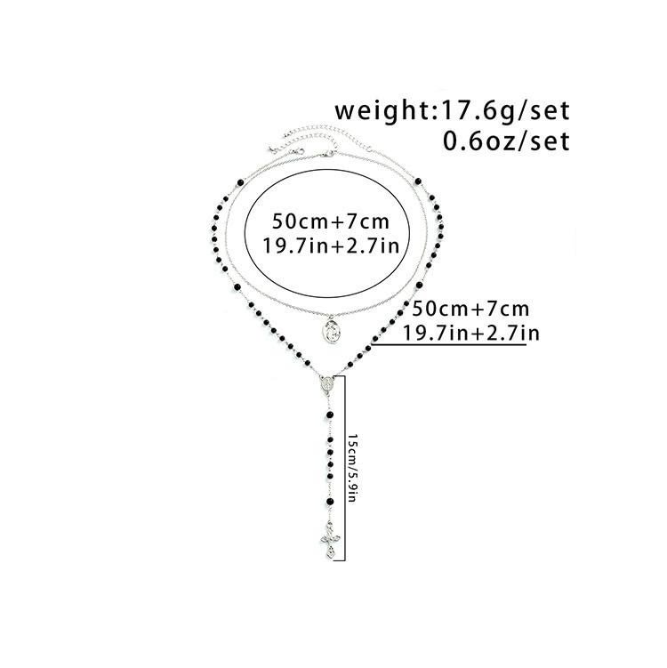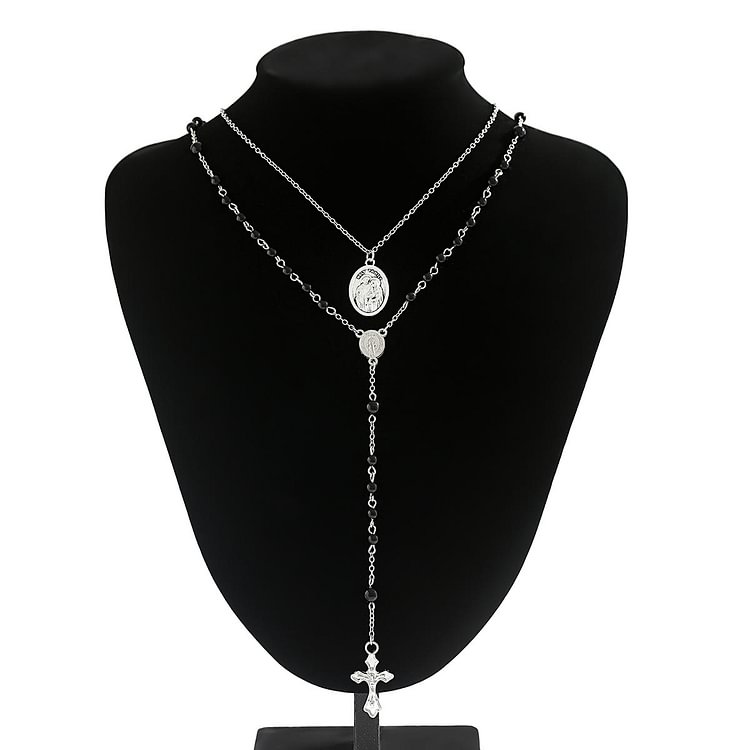Obsidian Beaded Holy Medal Cross Pendant Rosary Necklace