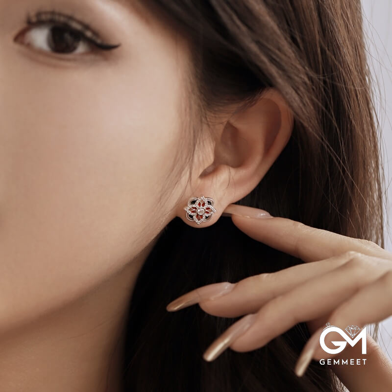 S925 Sterling Silver Four-leaf Clover Flowers Red Black Earrings