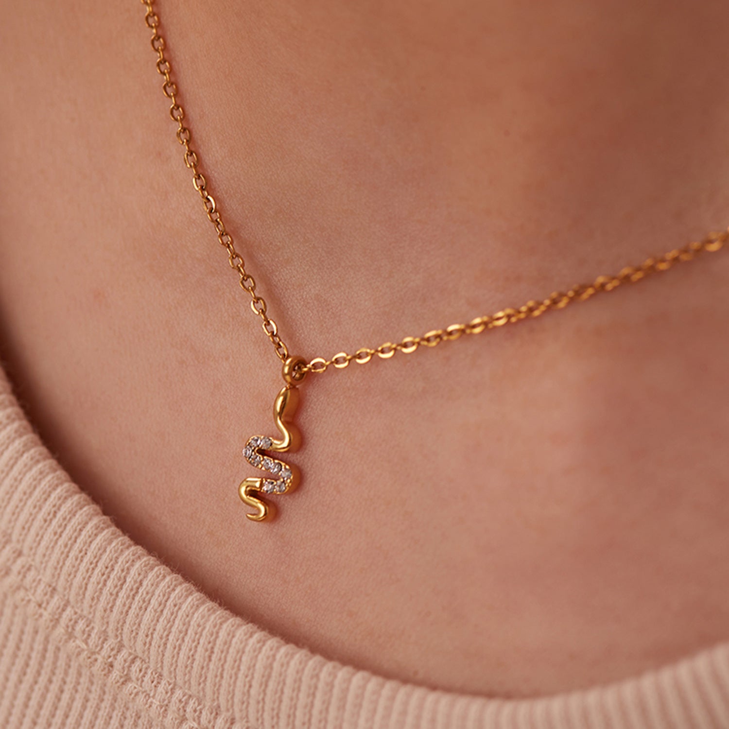 Stainless Steel Serpentine Pendant Inlaid with White Zircon Necklace