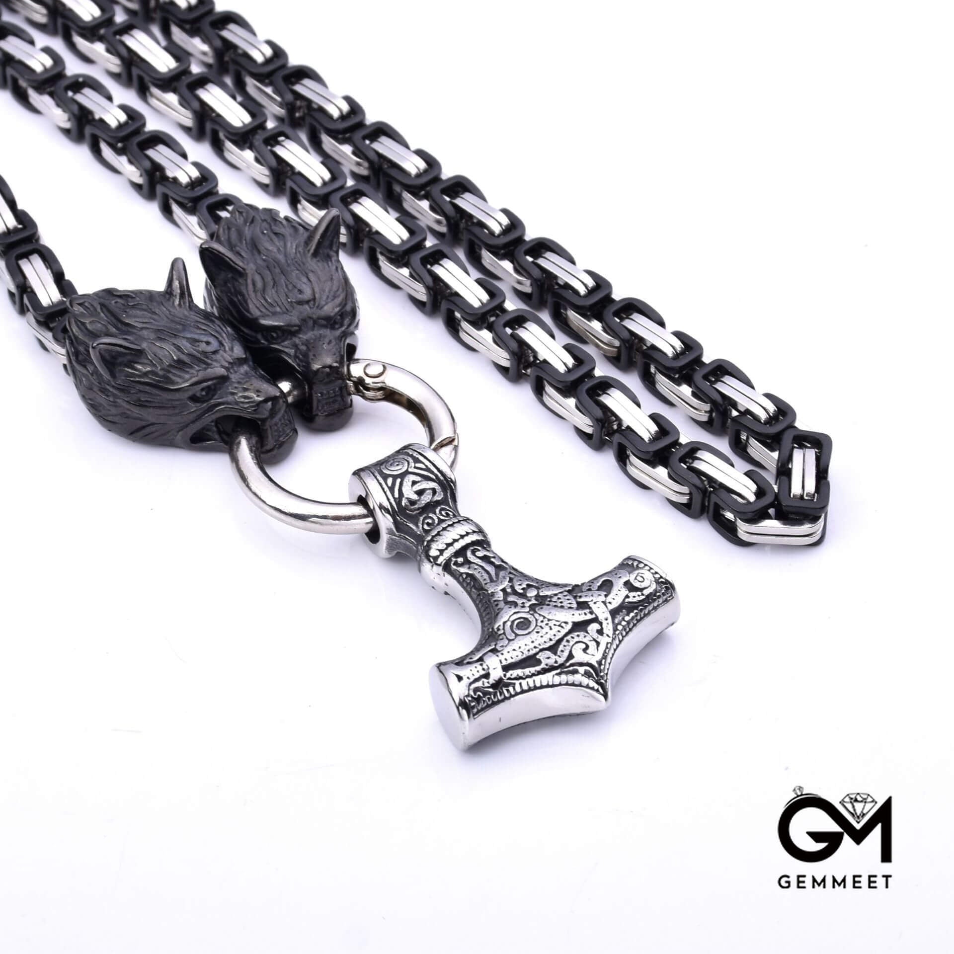 Stainless Steel Viking Wolf Head Thor Hammer Necklace
