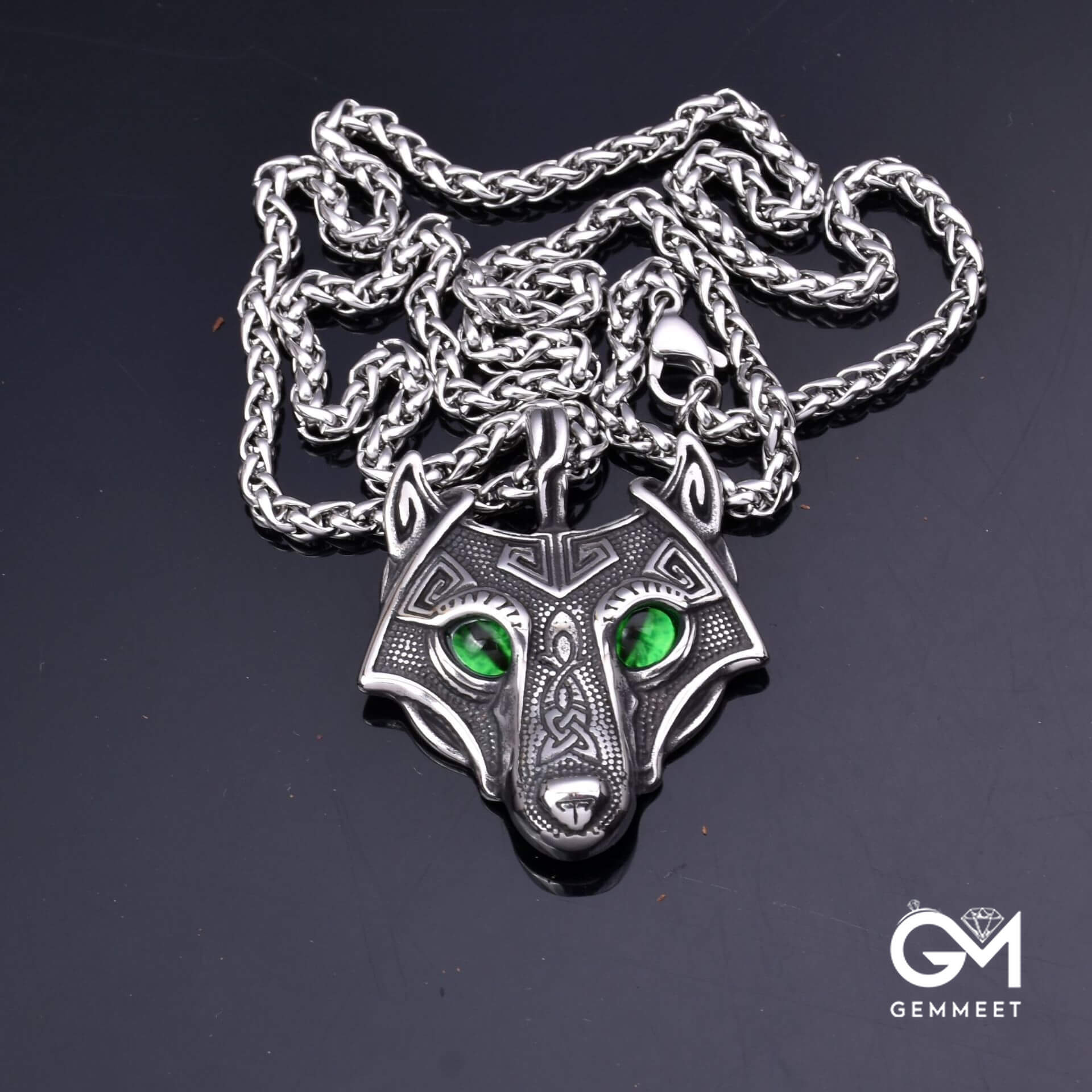 Stainless Steel Wolf Head Green Zircon Eye Necklace