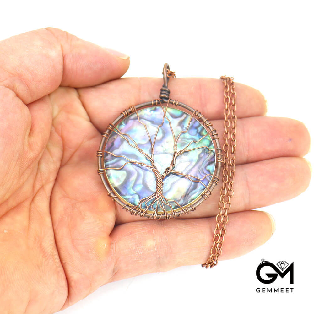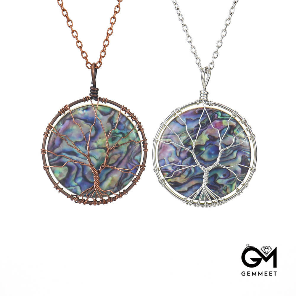 Synthetic Abalone Shell Tree of Life Disc Pendant Necklace