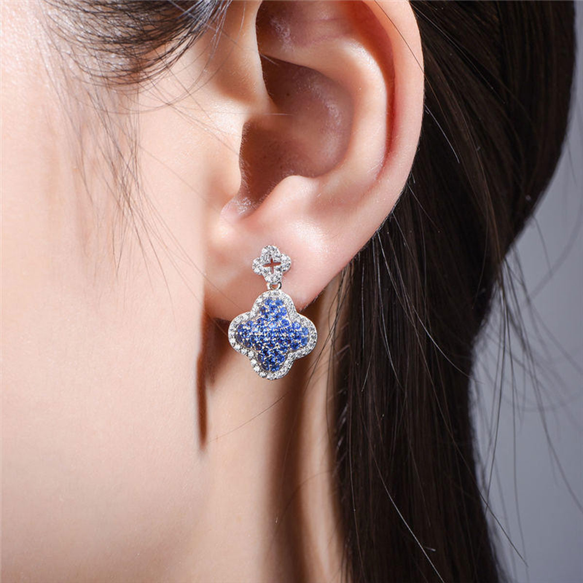 White Gold 4 Leaf Clover Shape Full Stones Drop Earrings